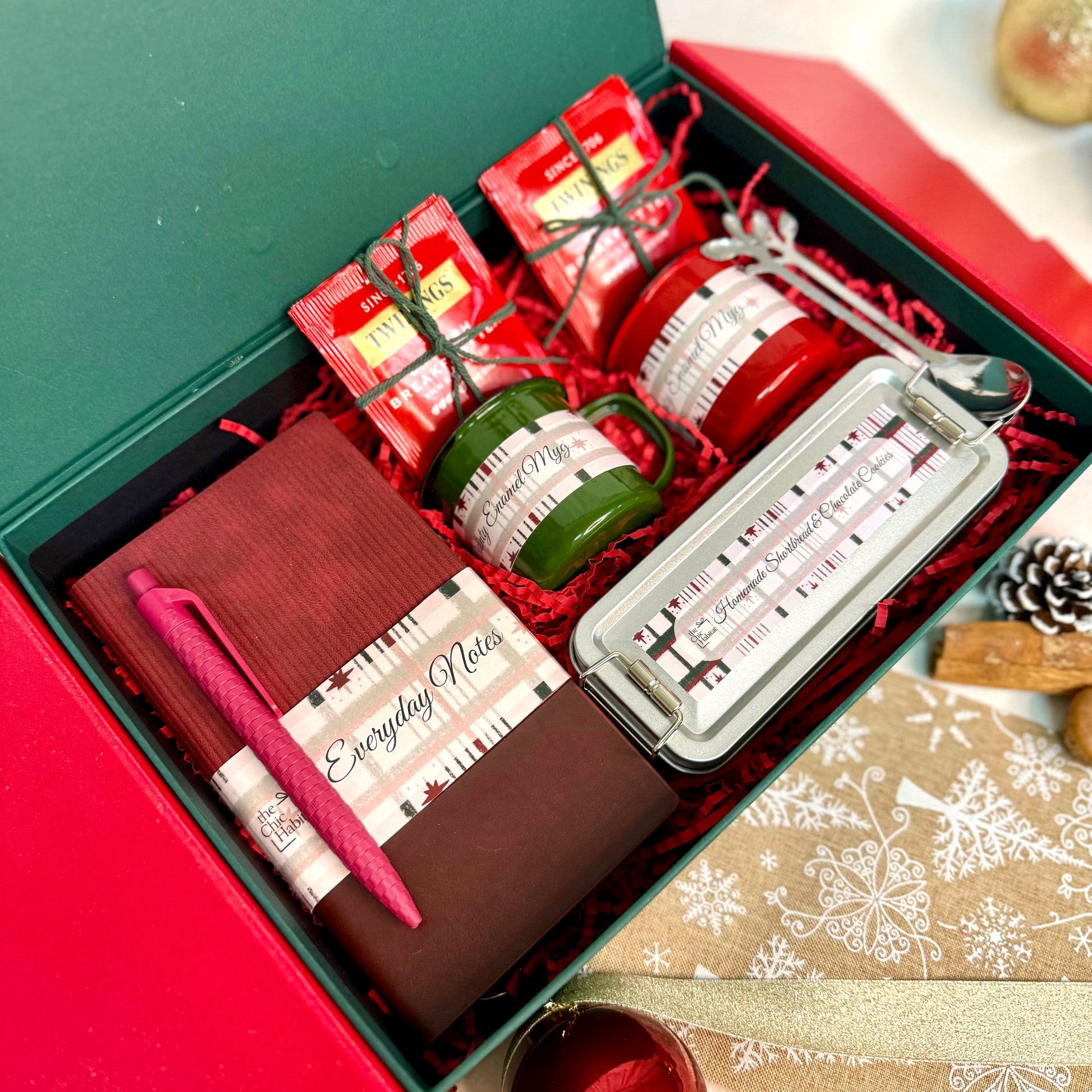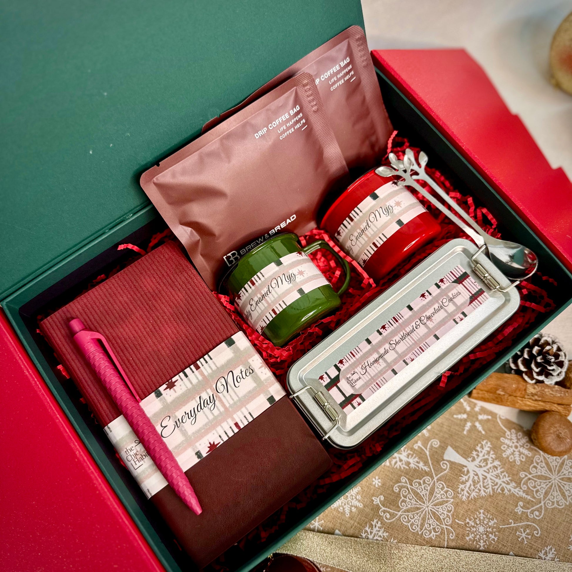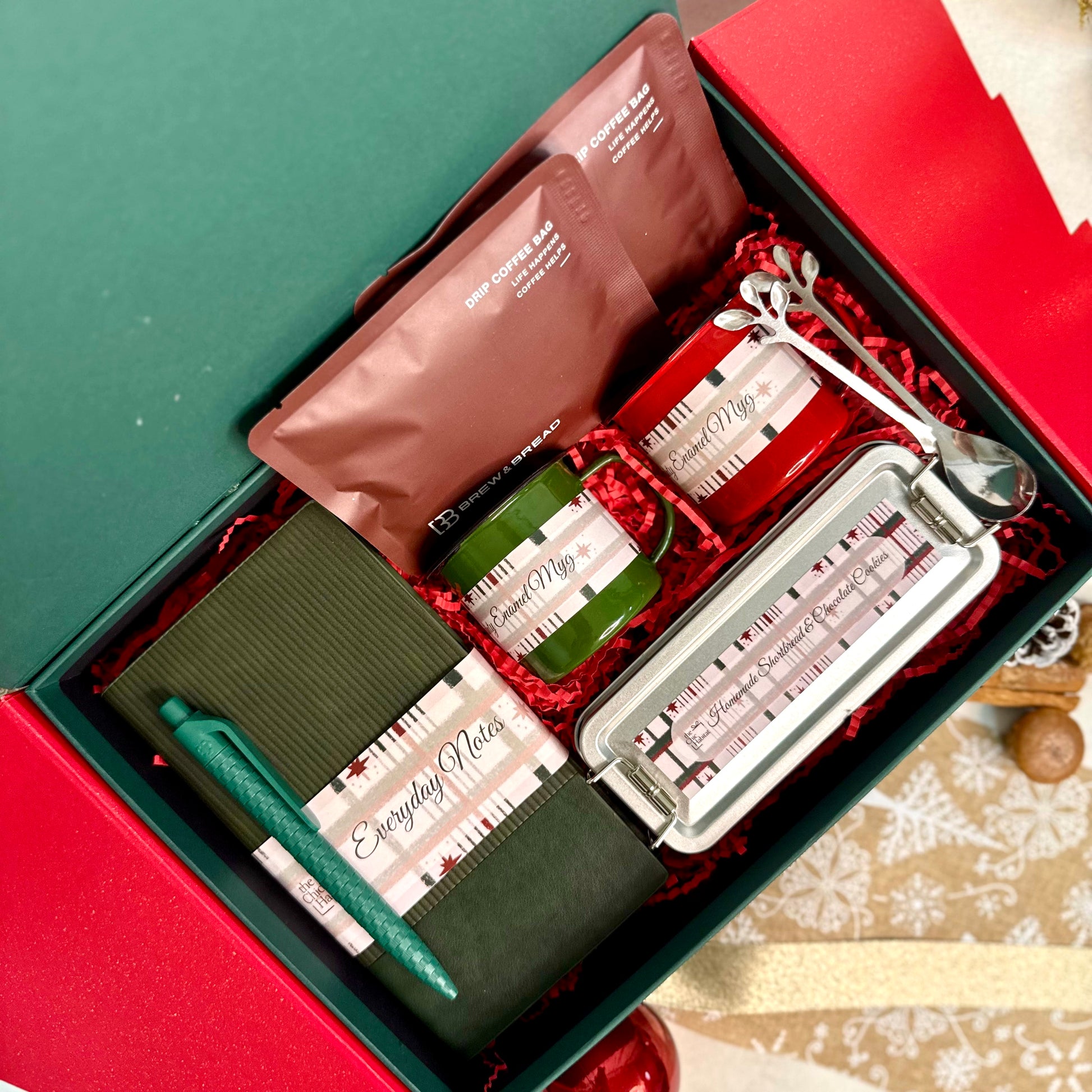 Find a little holiday refuge with Holly Haven — where simple joys and festive treats come together. This charming set pairs a stylish notebook and sustainable wheat-straw gel pen with homemade shortbread and chocolate cookies, alongside a mini enamel mug with a reindeer spoon and your choice of Nestle Kit Kat Chocolate drink, Twinings tea, or Brew & Bread coffee. Perfect for cozy mornings, quiet evenings, or sharing thoughtful moments, Holly Haven wraps warmth, cheer, and a sprinkle of holiday magic into one heartwarming gift. ✨