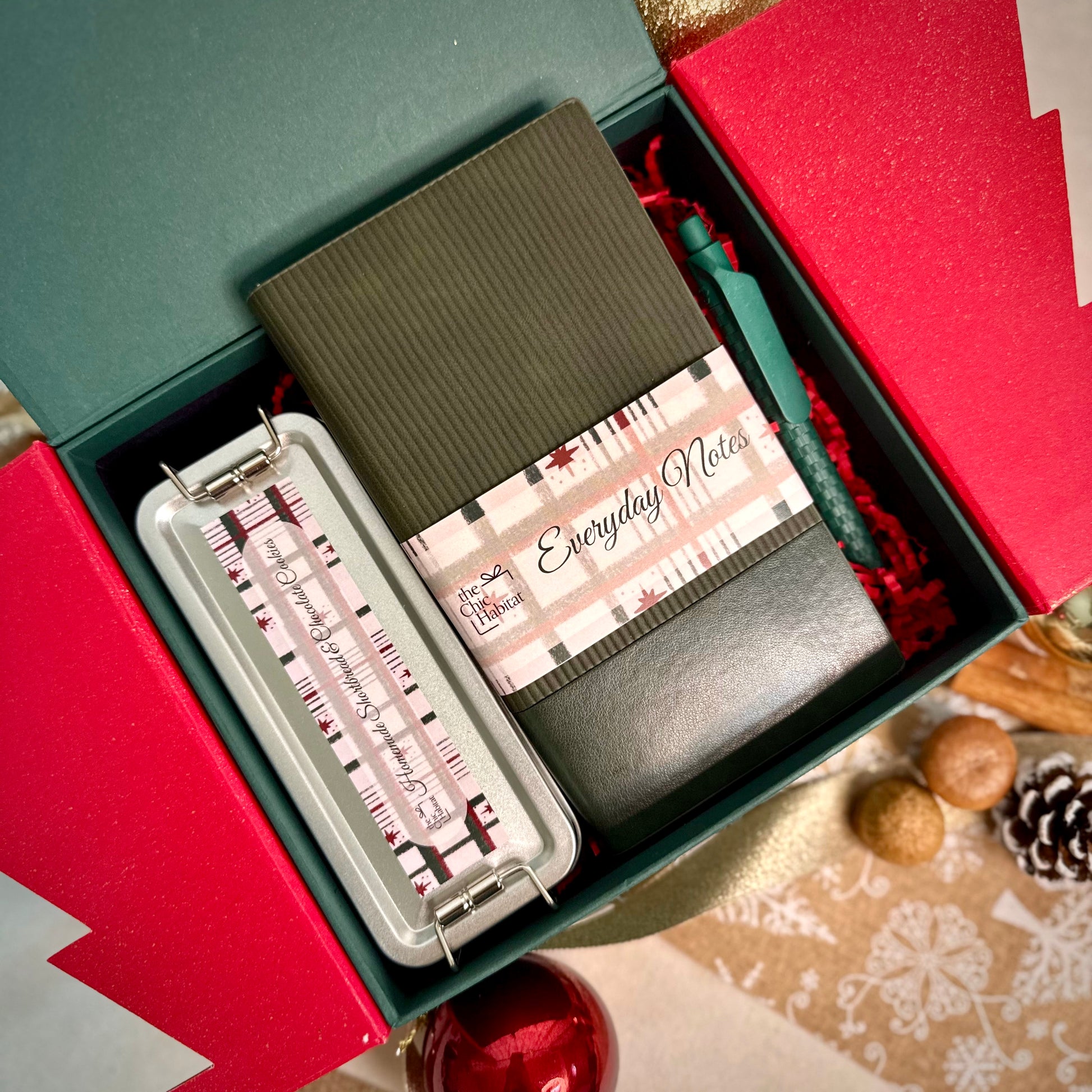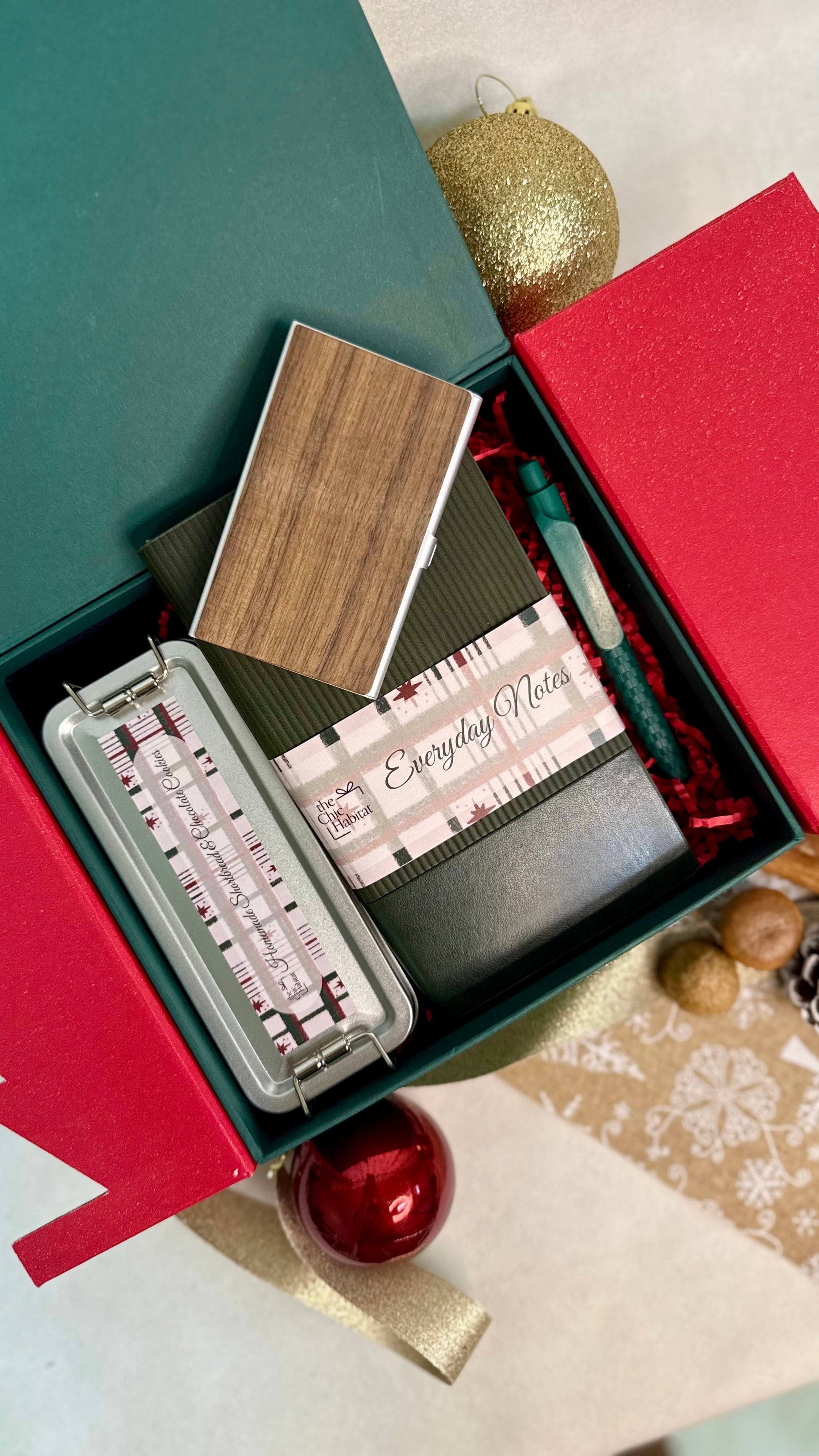Embrace the quiet magic of the season with Whispering Pines. This thoughtful set pairs homemade shortbread and chocolate cookies with a stylish notebook, a sustainable wheat-straw gel pen, and a chic wooden card holder — perfect for jotting festive wishes or planning cozy moments. Whether for yourself or someone special, Whispering Pines wraps simple joys and heartfelt gestures into a gift full of warmth and holiday charm. ✨