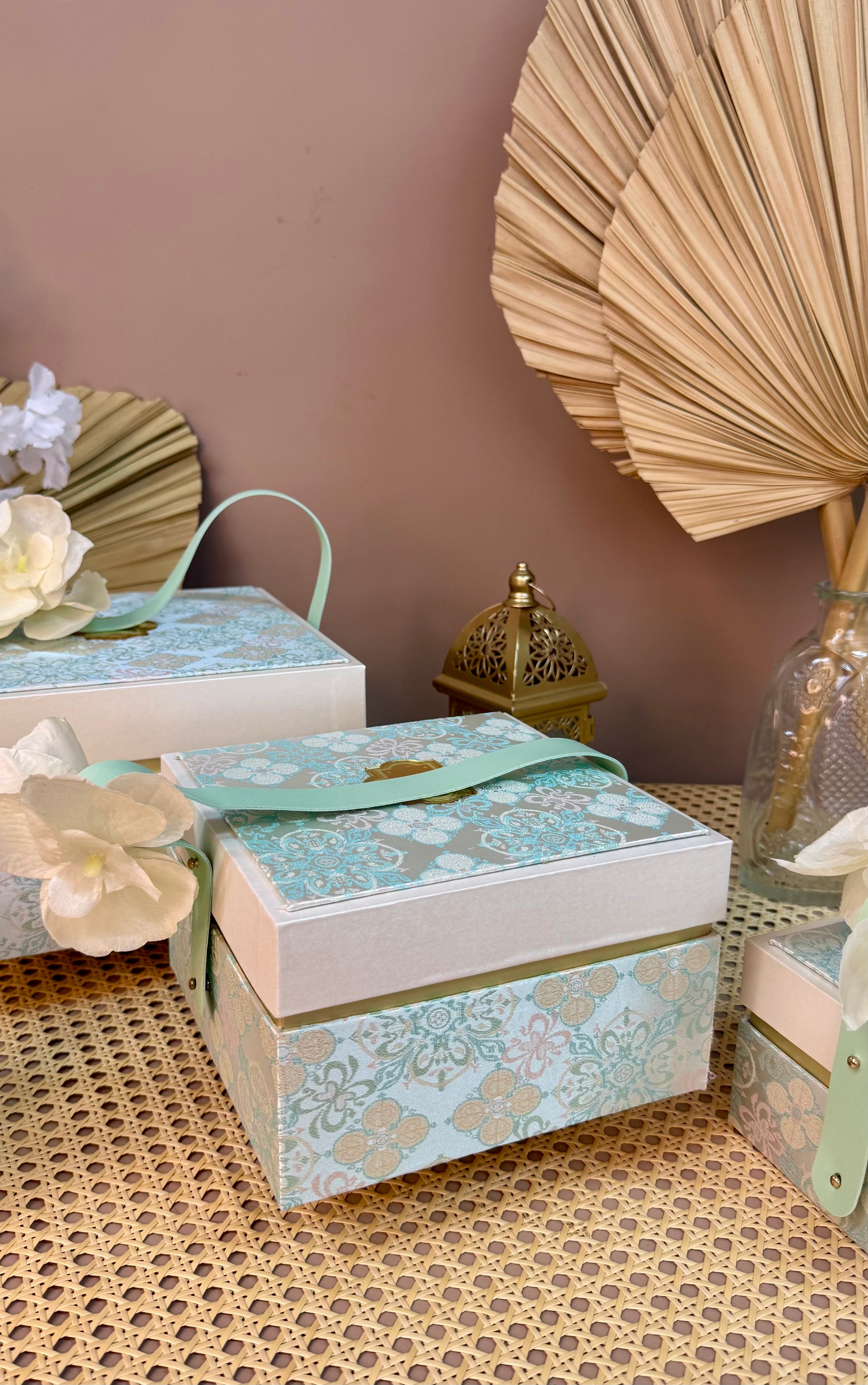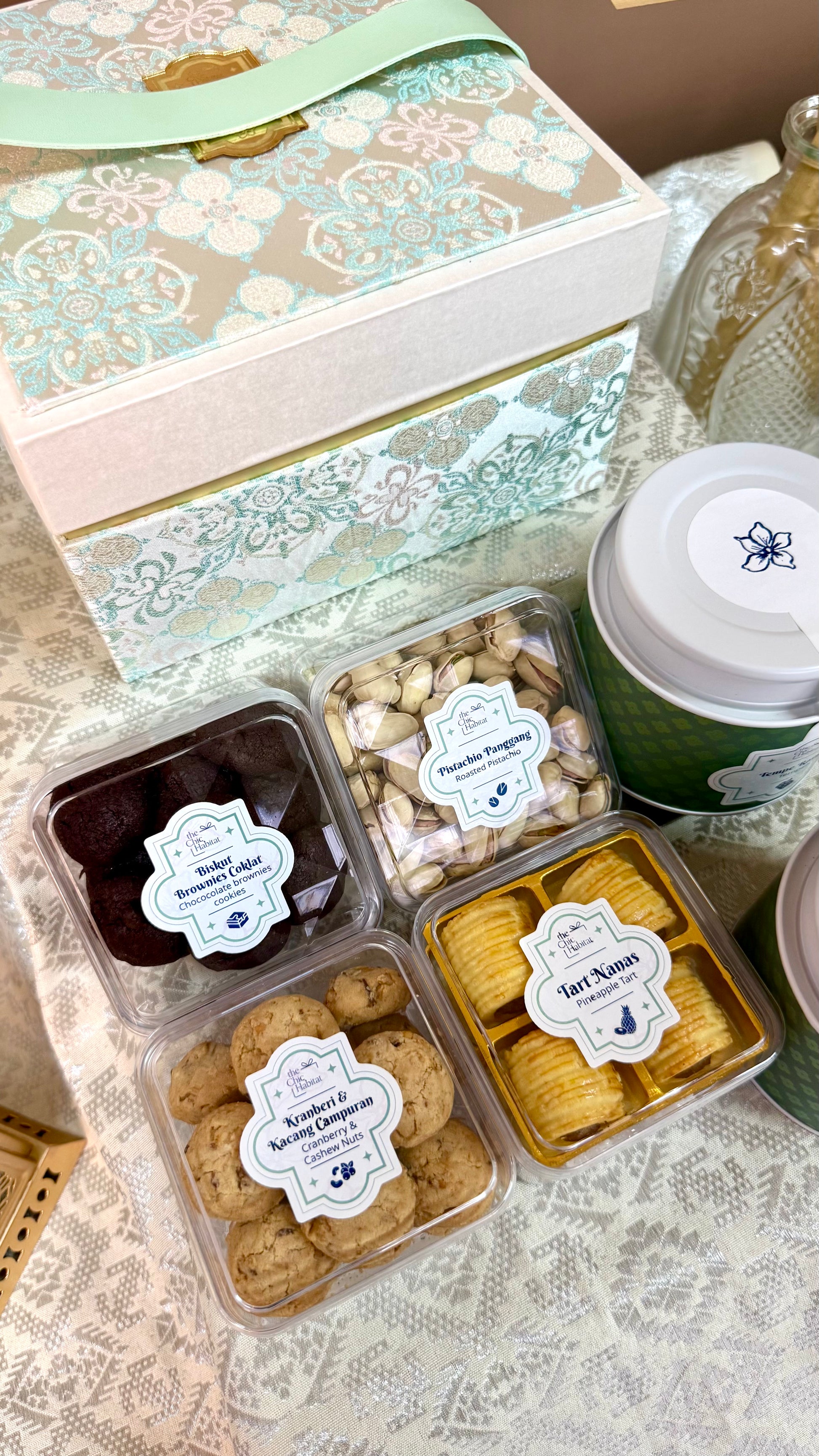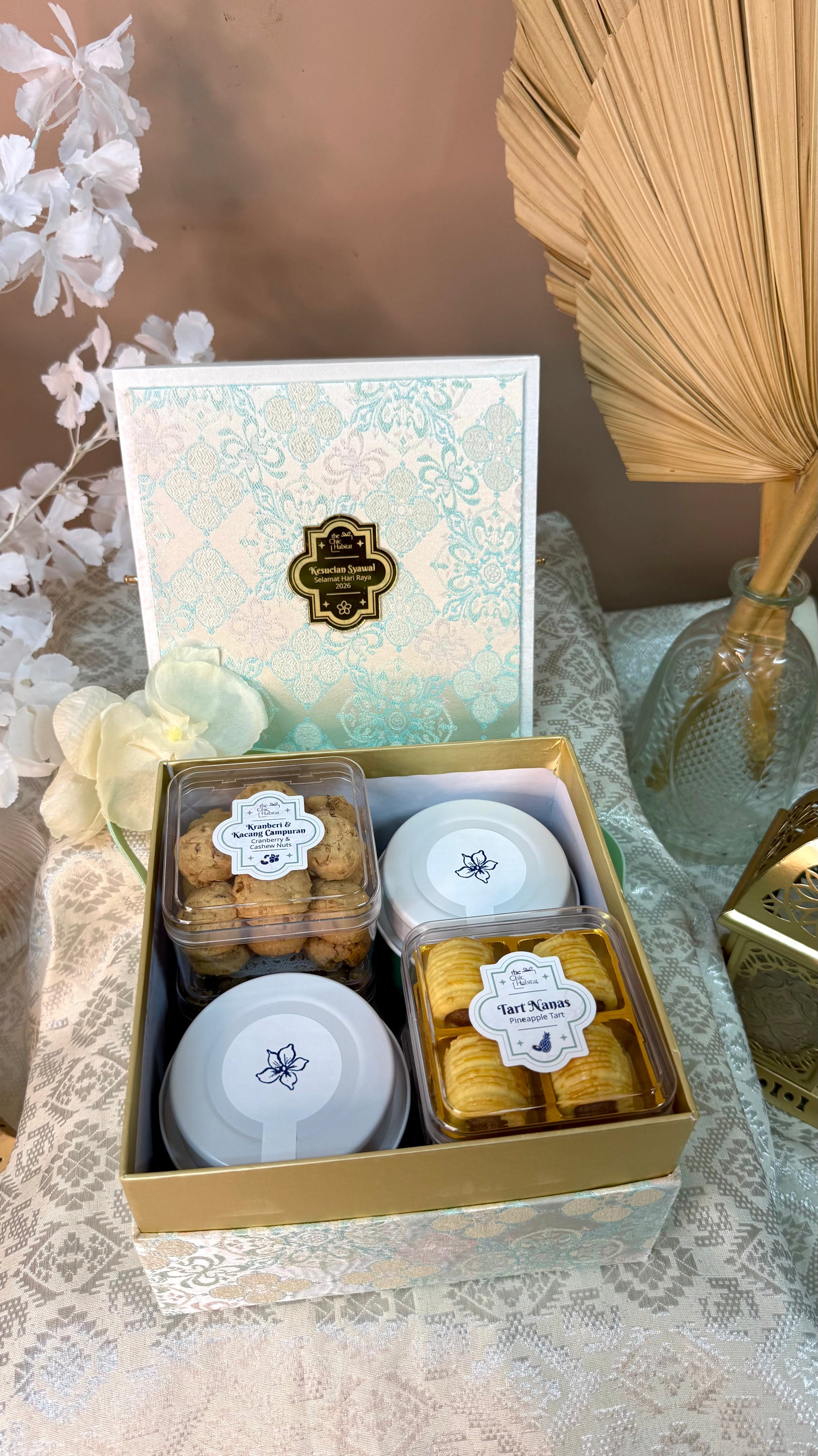 Packed in Batik Motive Gift Box (20x20x12cm) accompanied with Raya-Themed Gold Mirror Acrylic Tag.