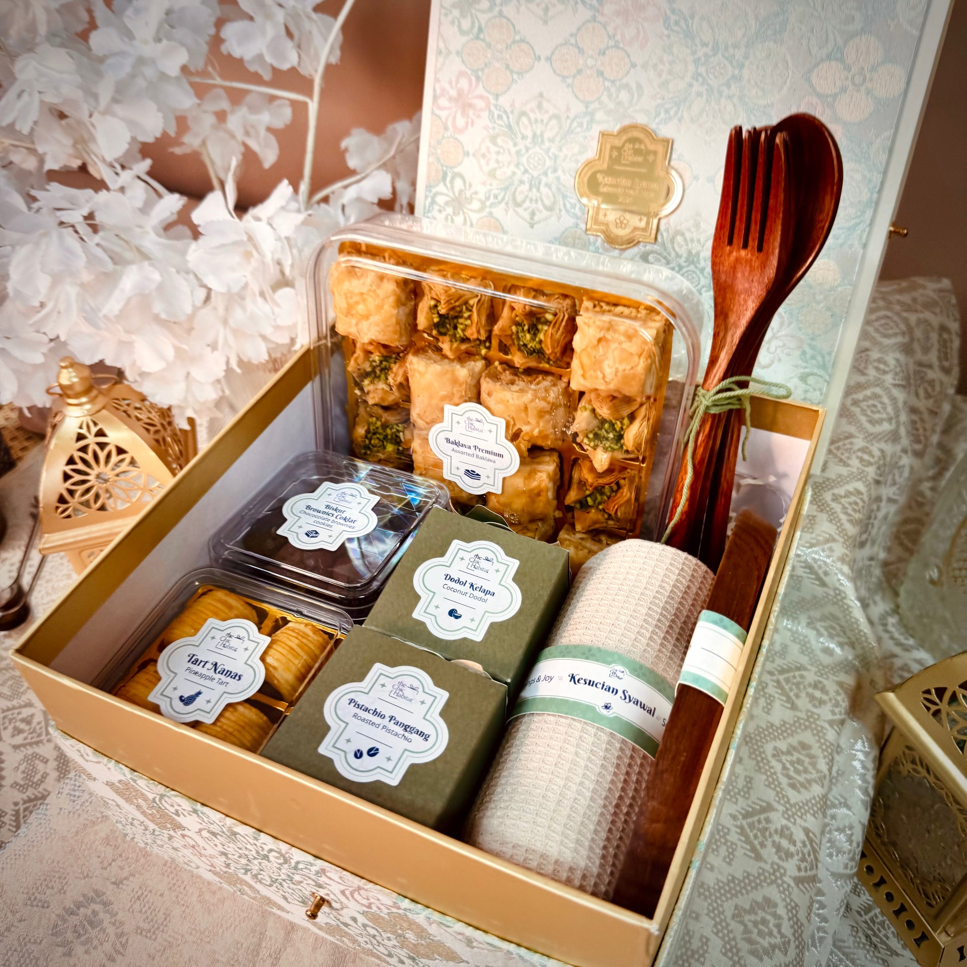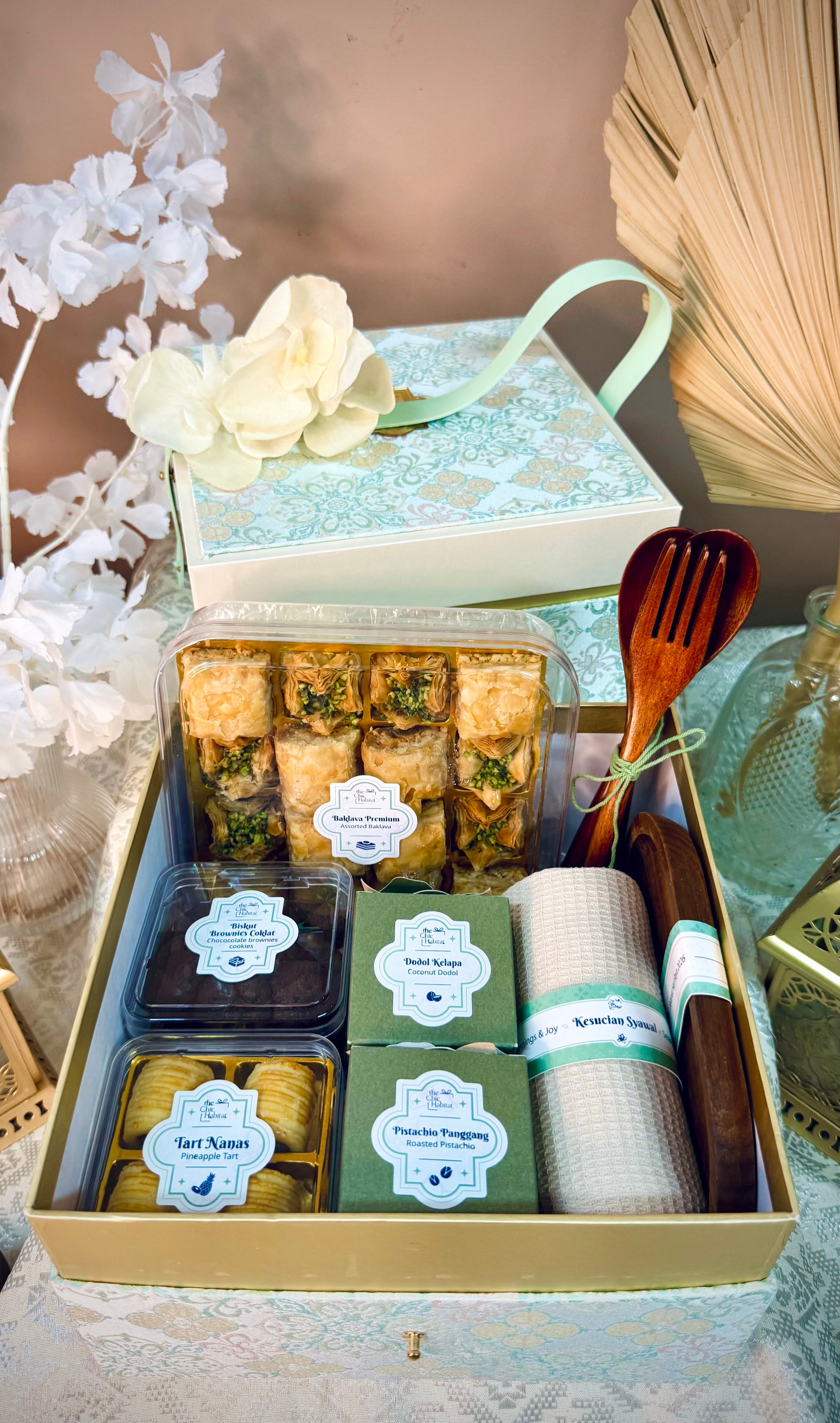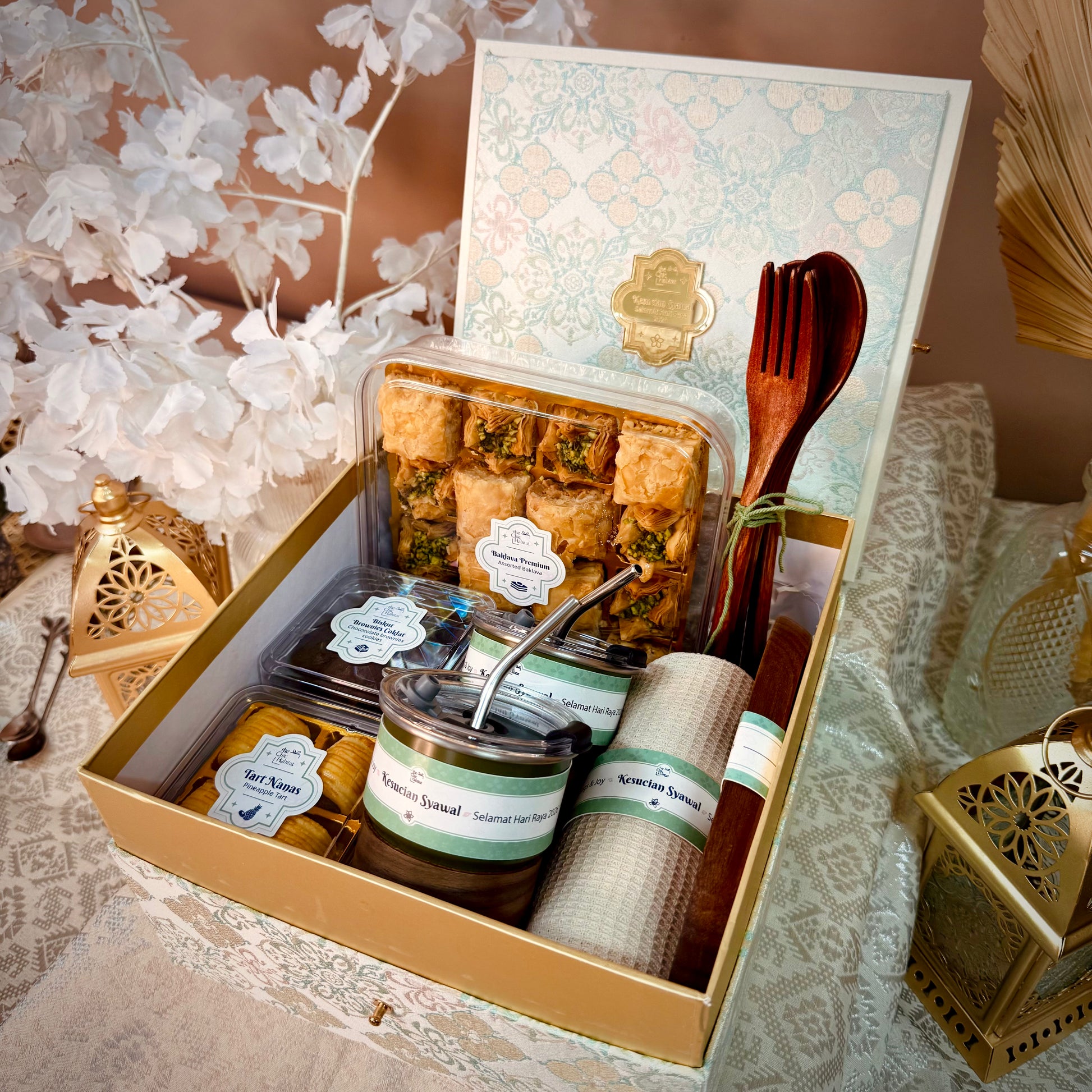 Packed in Batik Motive Gift Box (24x24x14cm) accompanied with Raya-Themed Gold Mirror Acrylic Tag.