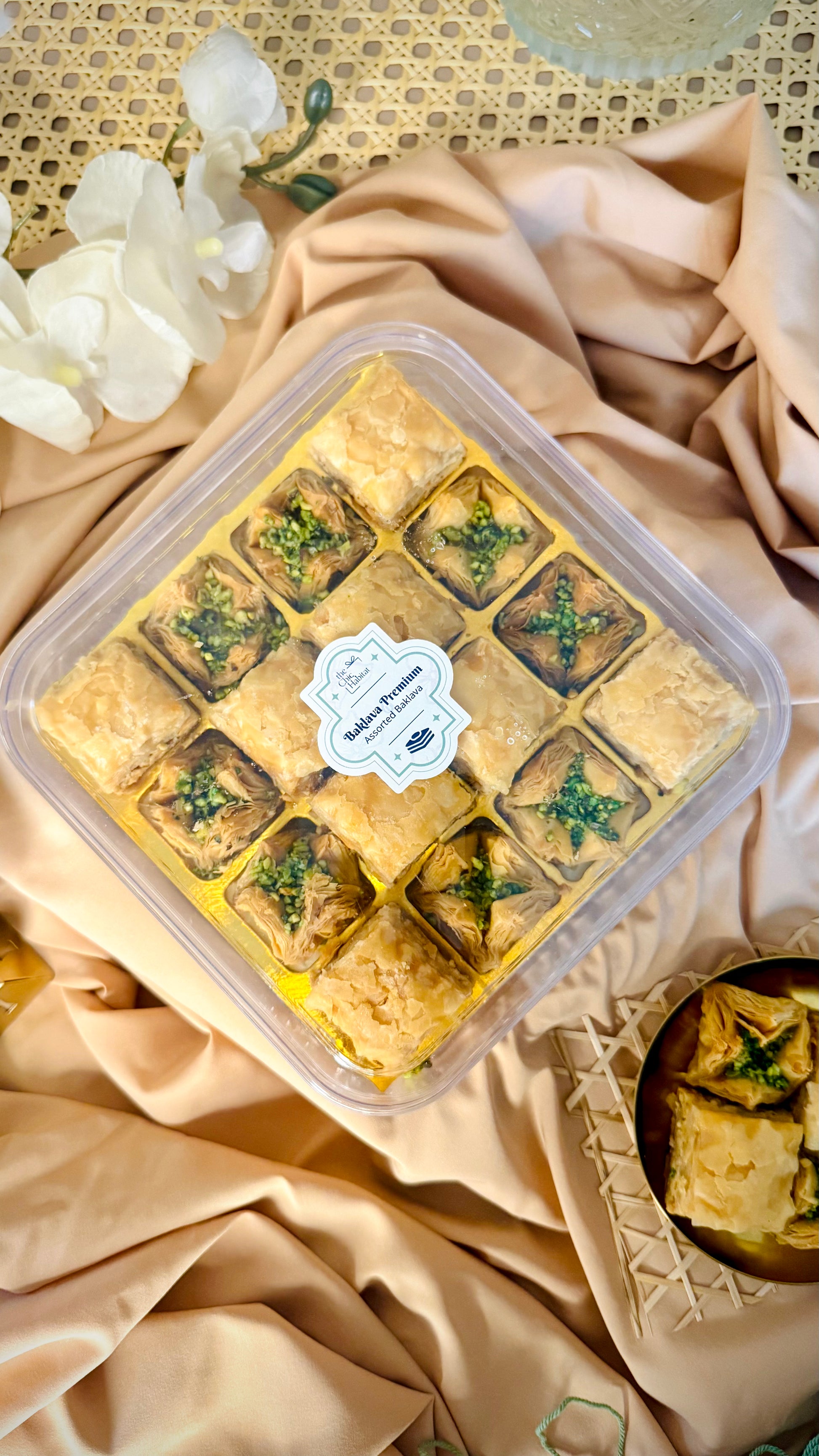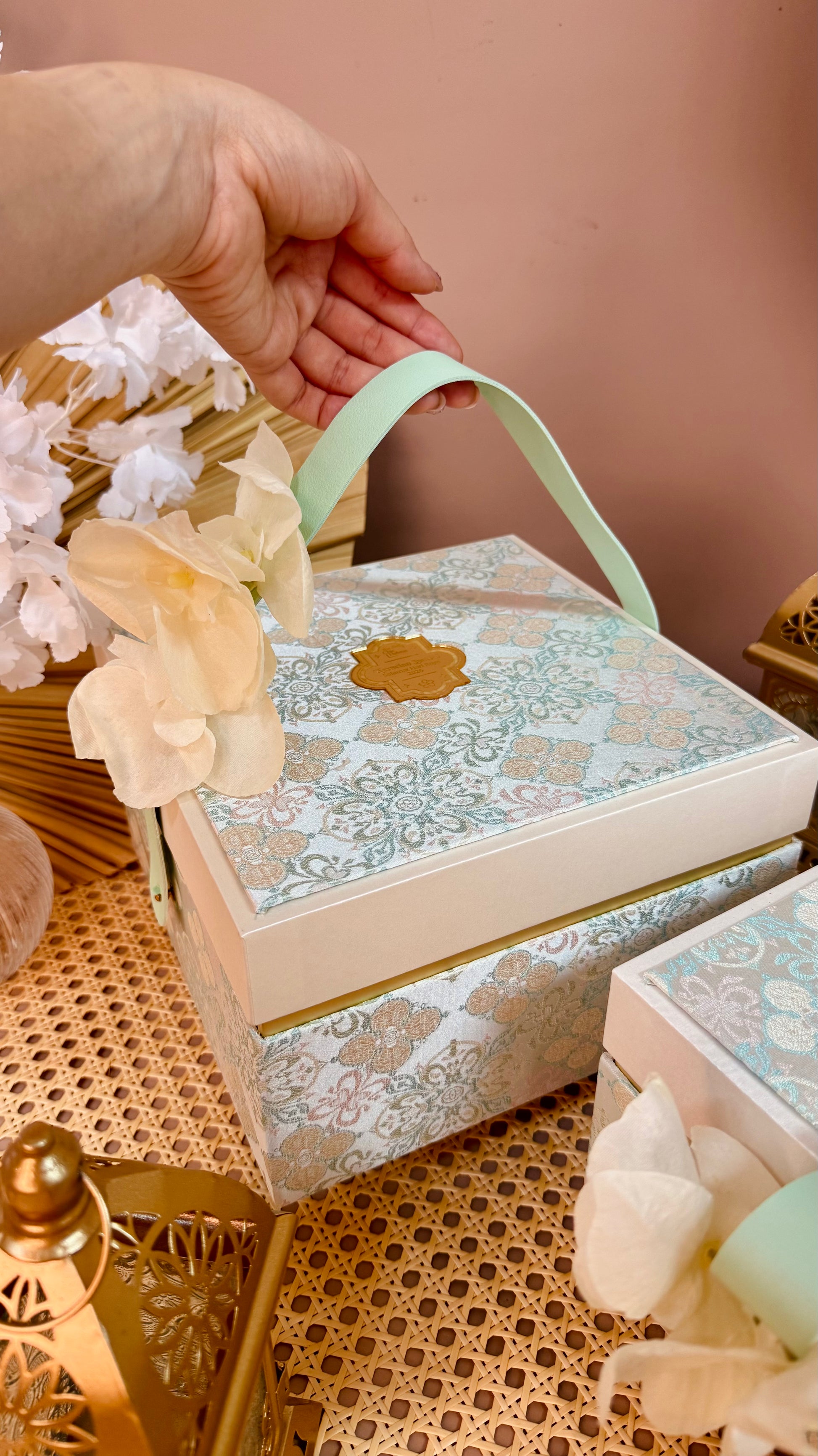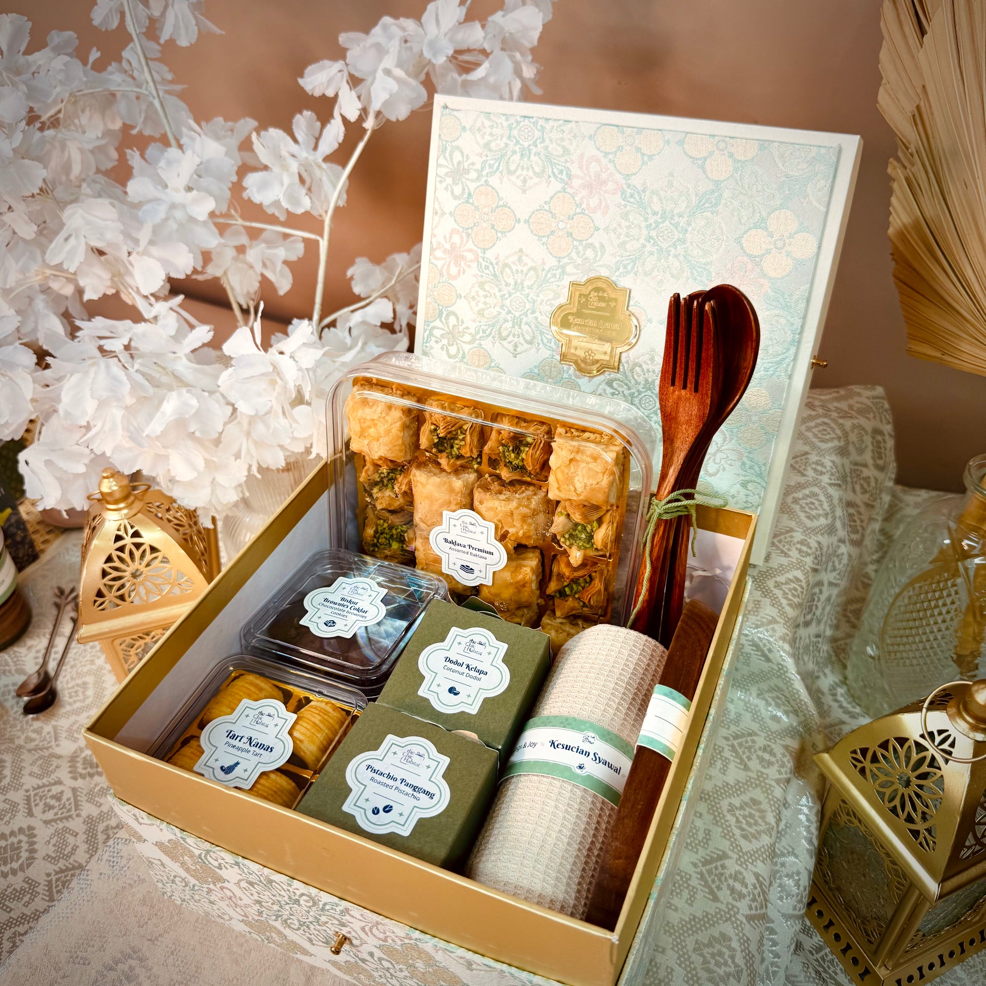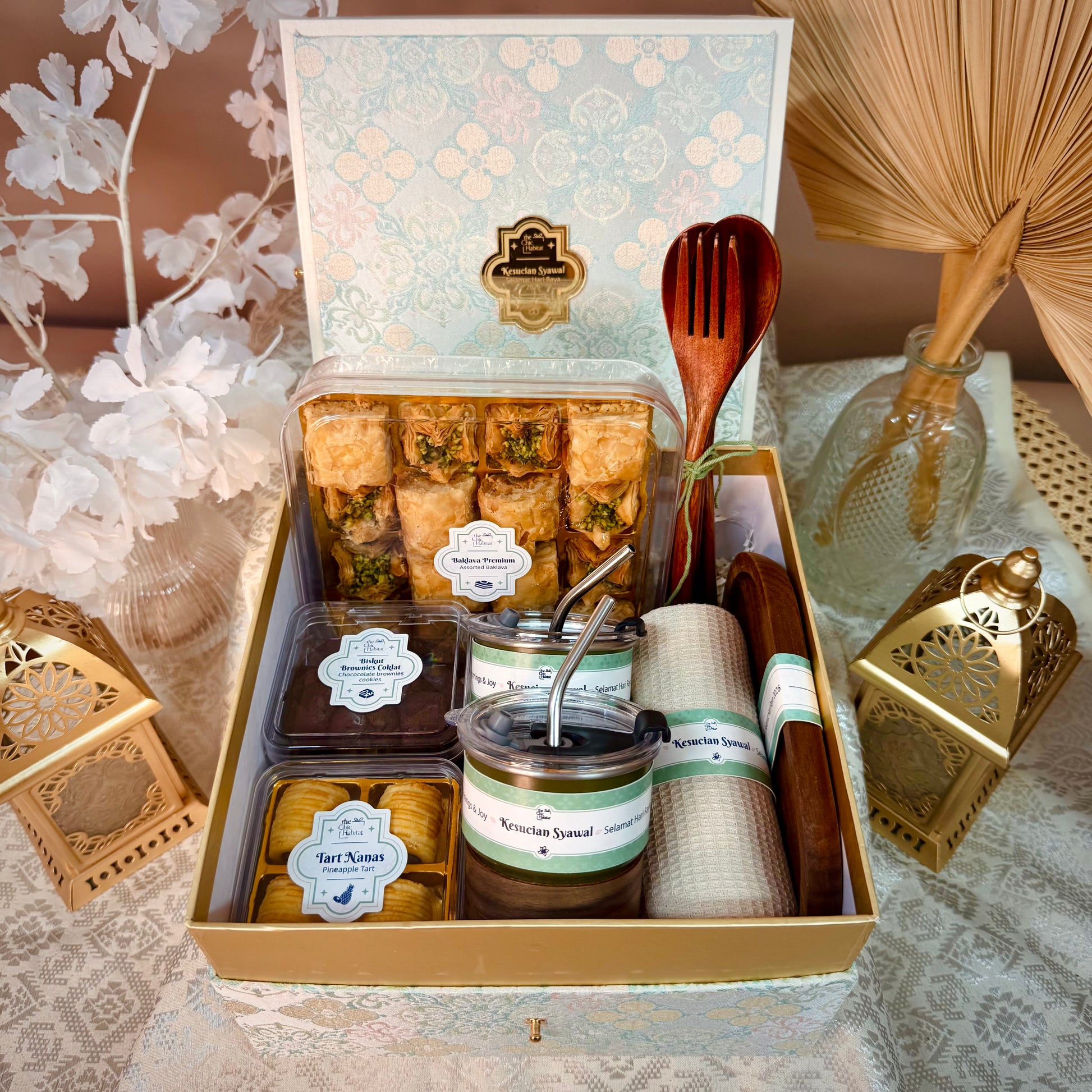 Packed in Batik Motive Gift Box (24x24x14cm) accompanied with Raya-Themed Gold Mirror Acrylic Tag.