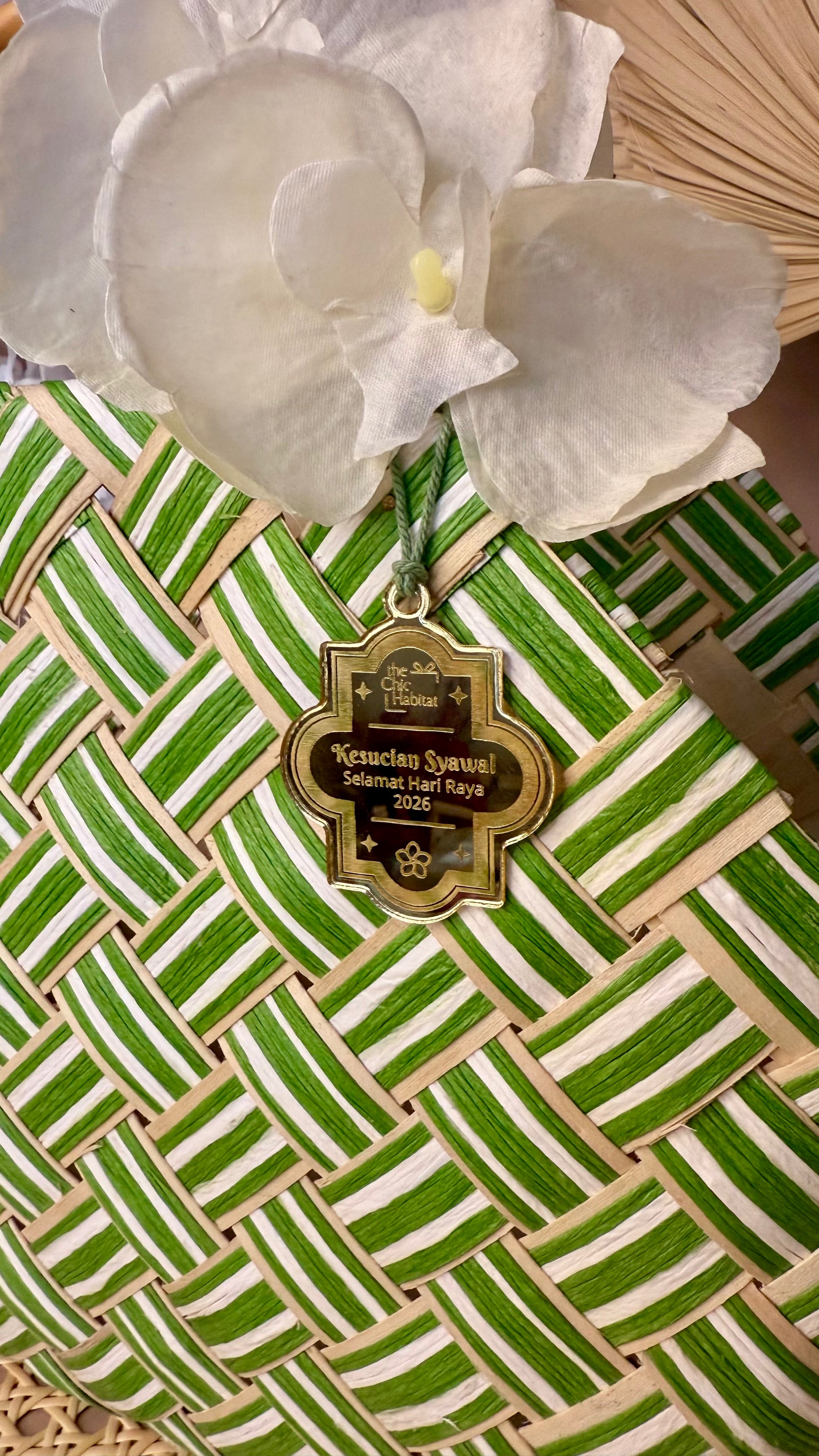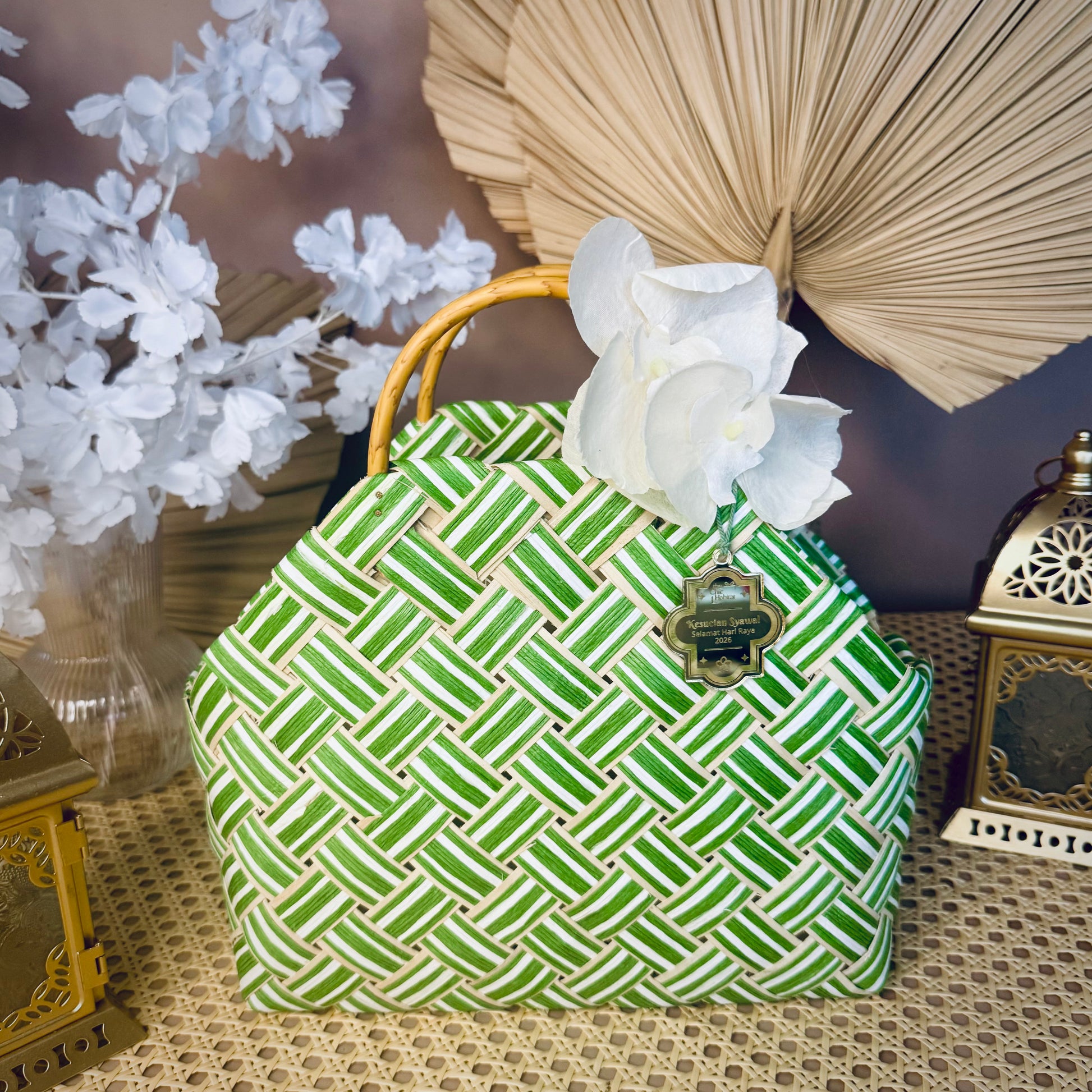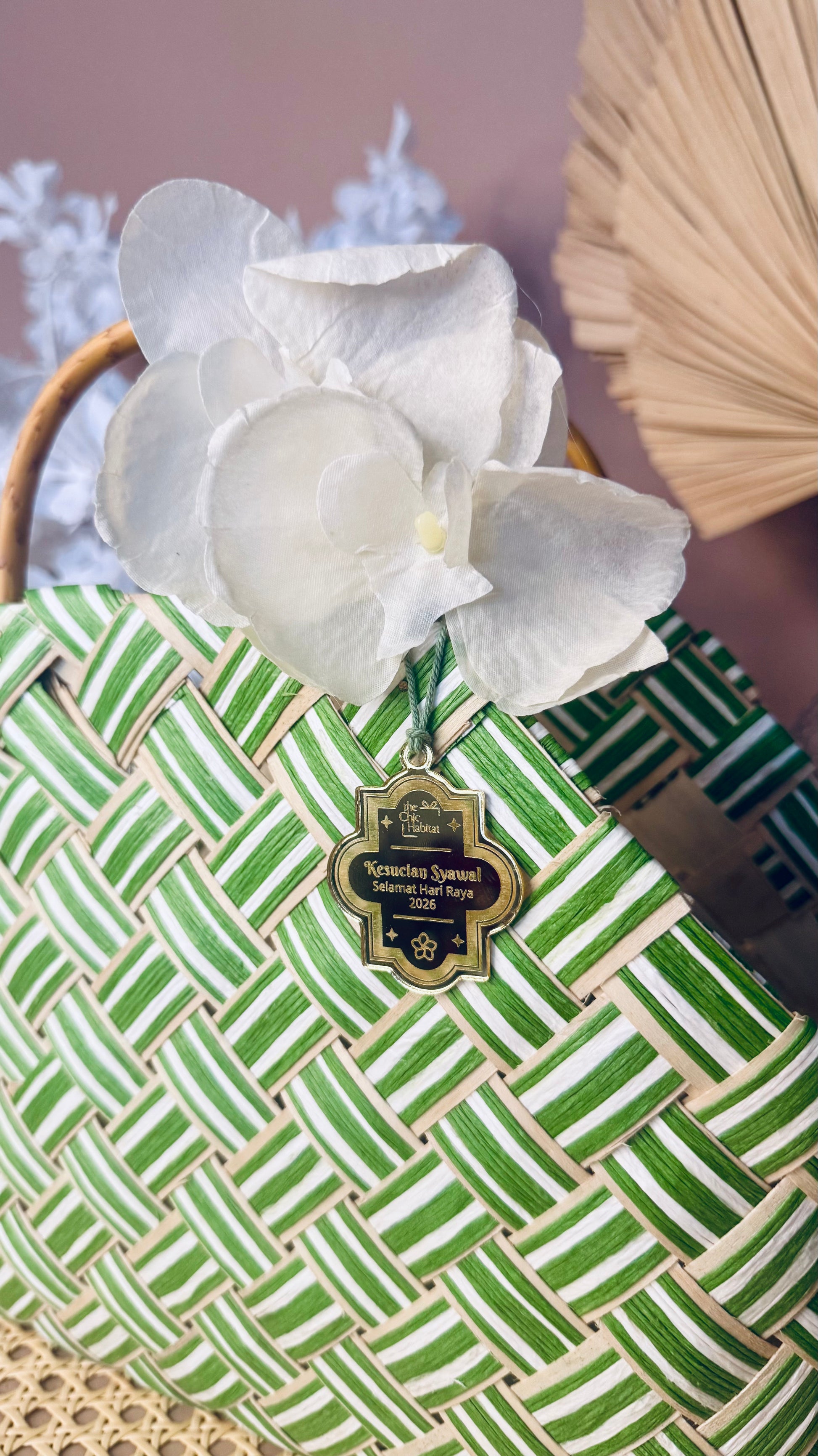 Packed in Woven Ketupat Handheld Basket (28x12x24cm) accompanied with Raya-Themed Gold Mirror Acrylic Tag.
