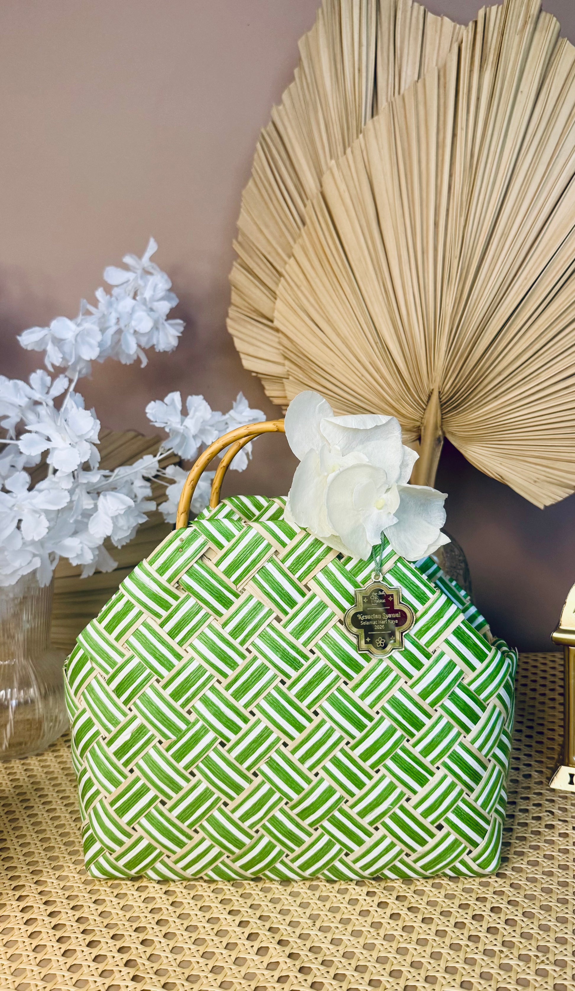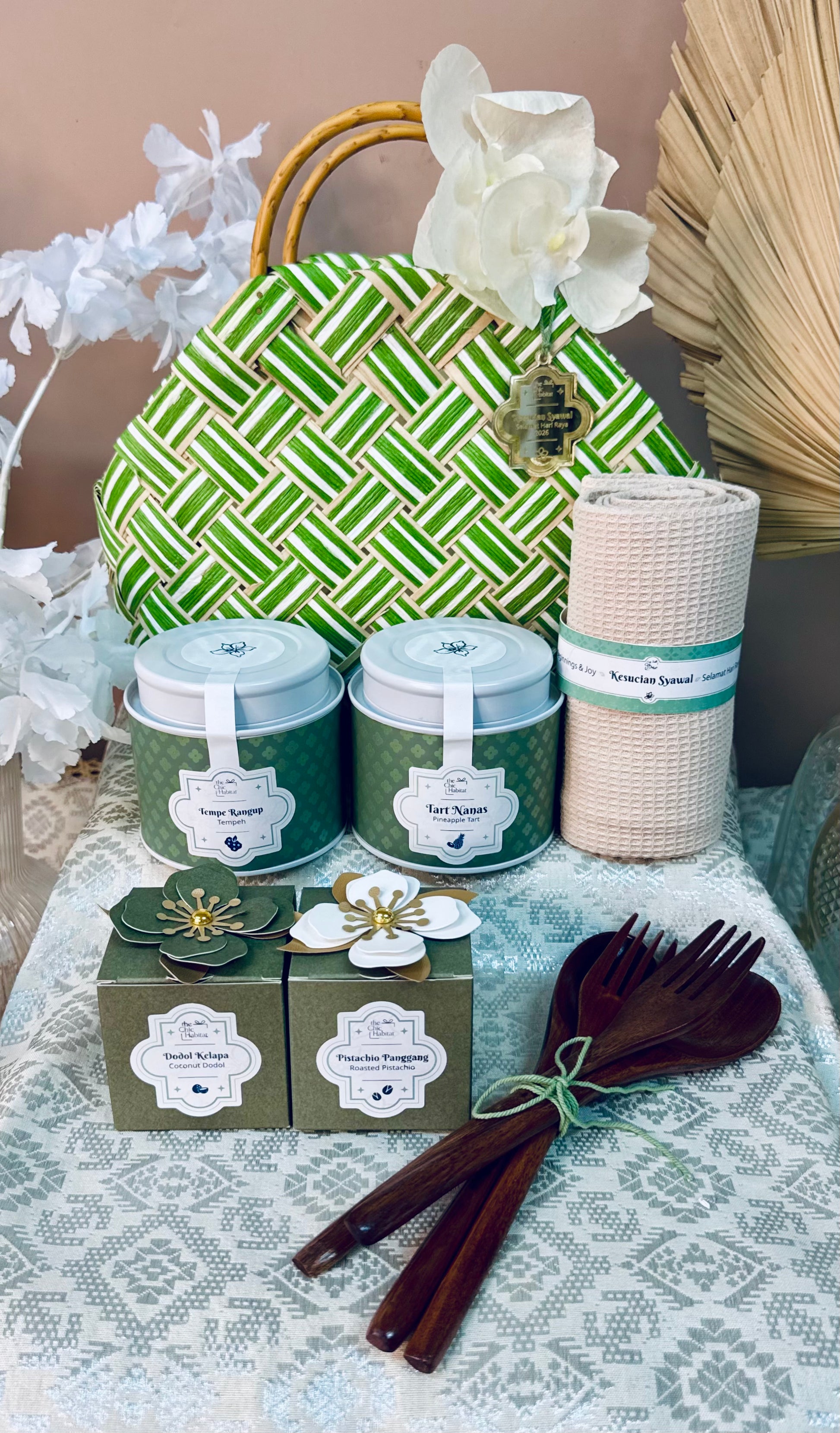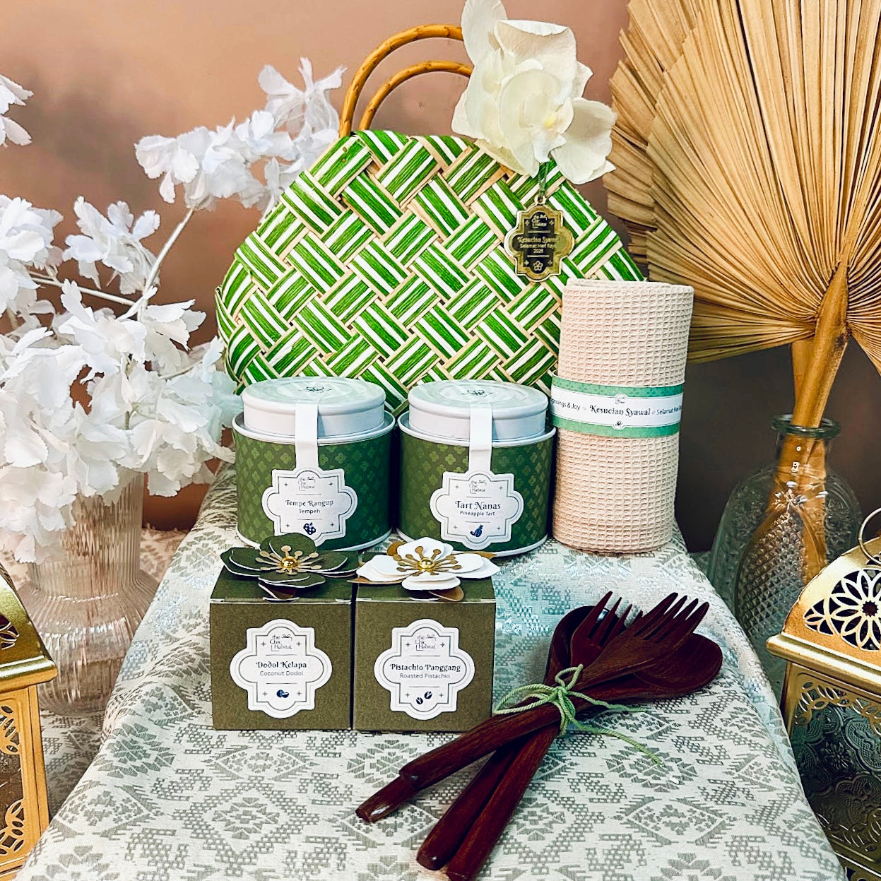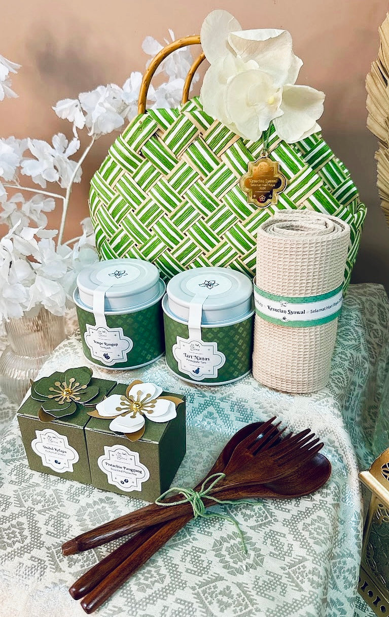Packed in Woven Ketupat Handheld Basket (28x12x24cm) accompanied with Raya-Themed Gold Mirror Acrylic Tag.